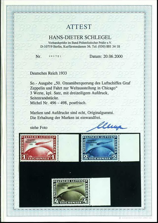 | Zusatzinformationen und Suchstichworte: | Dr. Reinhard Fischer 188. Auktion 1. - 3. September 2022 Los 2264 Deutsches Reich, 1933/45 Drittes Reich 1 - 4 RM Chicagofahrt, 3 Werte komplett, tadellos postfrisch, unsigniert, Fotoatteste H.-D. Schlegel BPP (2000 und 2016): "...postfrisch. Marken und Aufdrucke sind echt, Originalgummierung. Die Qualität der Marken ist einwandfrei.", Mi. 4.300.- (Hinweis: Beide Atteste für den Satz wurden mit anhängenden Seitenrändern ausgestellt, die aufgrund von Haftspuren vom Sammler entfernt wurden.) Ausruf 1.300,00 EUR |