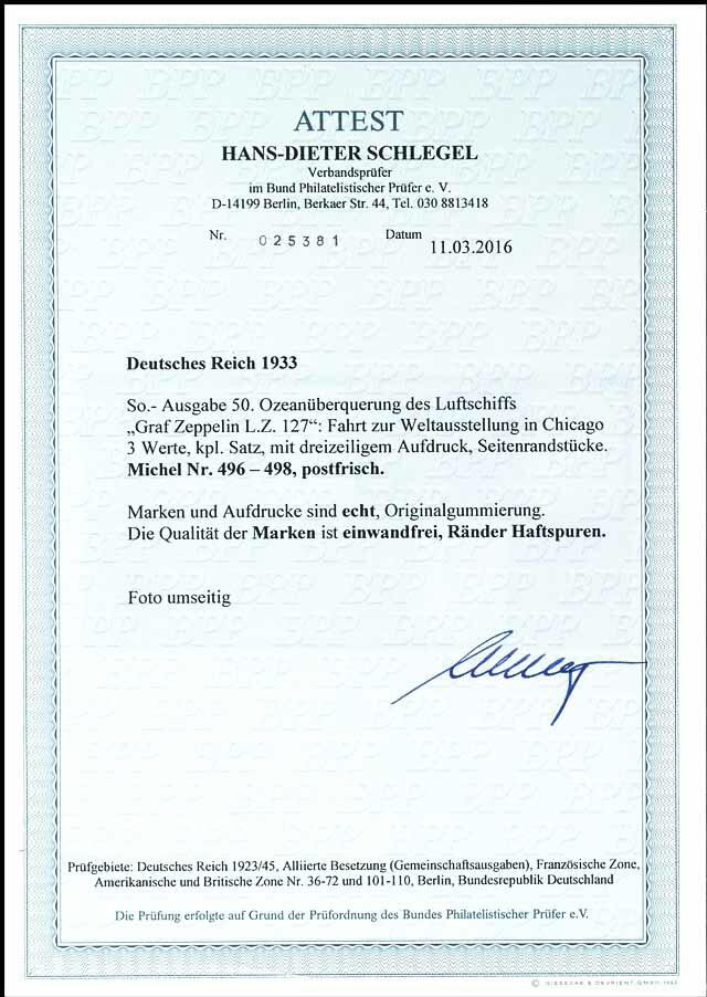 | Zusatzinformationen und Suchstichworte: | Dr. Reinhard Fischer 188. Auktion 1. - 3. September 2022 Los 2264 Deutsches Reich, 1933/45 Drittes Reich 1 - 4 RM Chicagofahrt, 3 Werte komplett, tadellos postfrisch, unsigniert, Fotoatteste H.-D. Schlegel BPP (2000 und 2016): "...postfrisch. Marken und Aufdrucke sind echt, Originalgummierung. Die Qualität der Marken ist einwandfrei.", Mi. 4.300.- (Hinweis: Beide Atteste für den Satz wurden mit anhängenden Seitenrändern ausgestellt, die aufgrund von Haftspuren vom Sammler entfernt wurden.) Ausruf 1.300,00 EUR |