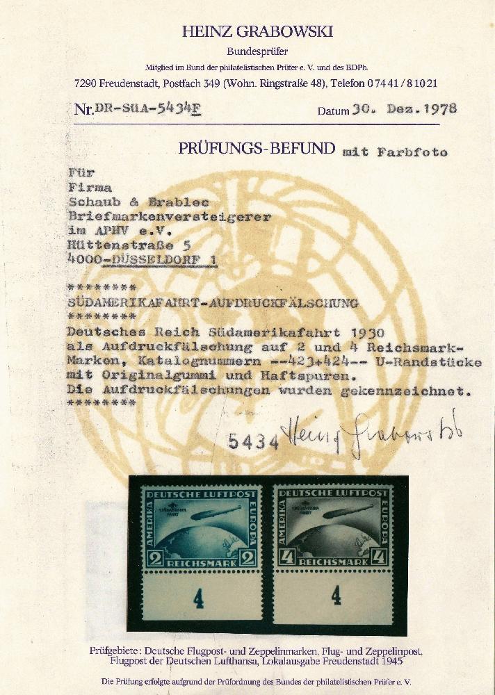 | Zusatzinformationen und Suchstichworte: | Aufdruckfälschungen auf MiNr. 423+424. Attest Kopie des Prüfers. |