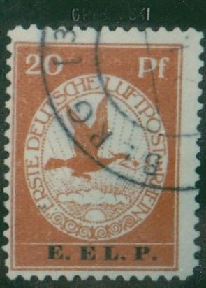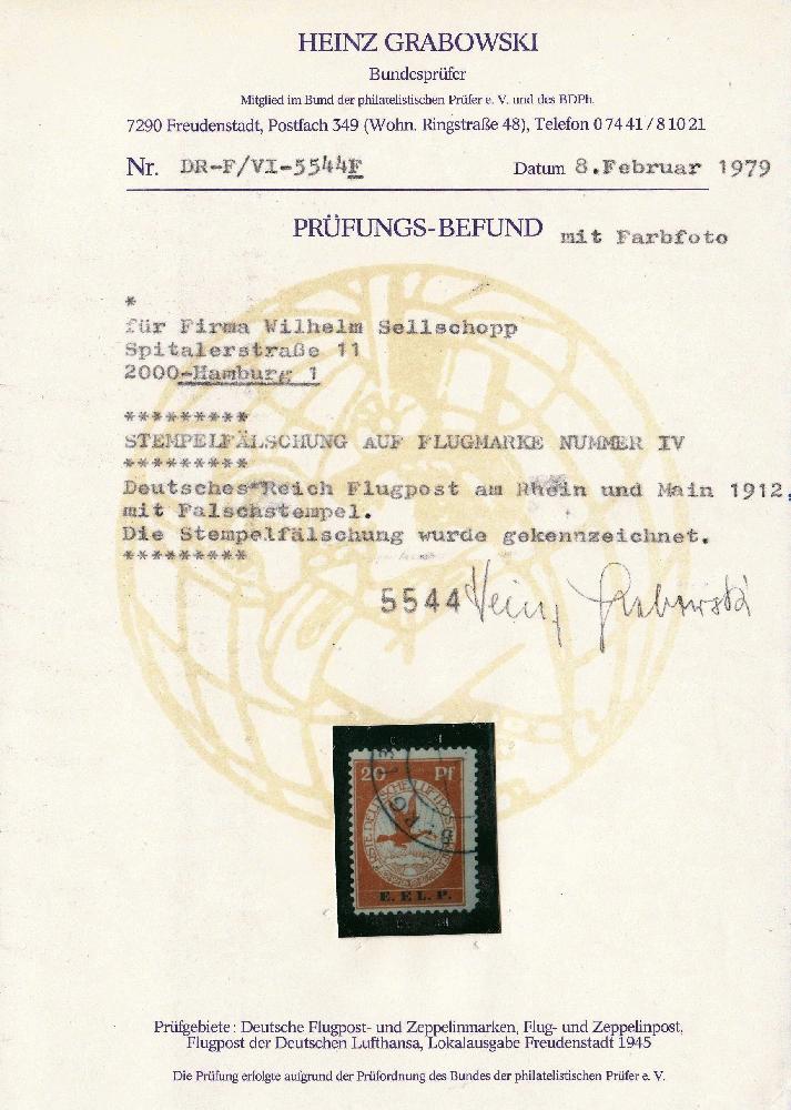 | Zusatzinformationen und Suchstichworte: | Stempelfälschung auf Flugmarke DR Nr. IV Attest Kopie des Prüfers. |