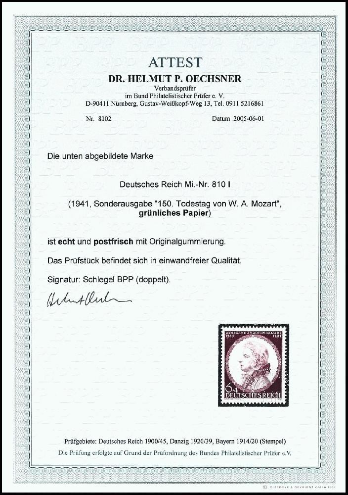 | Zusatzinformationen und Suchstichworte: | Dr. Reinhard Fischer 188. Auktion 1. - 3. September 2022 Los 2383 Deutsches Reich, 1933/45 Drittes Reich 6 Pfg "150. Todestag von W. A. Mozart" auf grünlichem Papier, tadellos postfrisch, gepr. Schlegel BPP und Fotoattest Dr. Oechsner BPP: "in einwandfreier Qualität.", Mi. 2.000.- Ausruf 600,00 EUR |