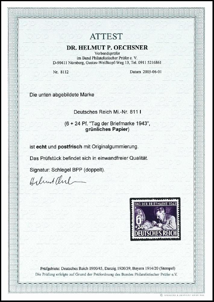 | Zusatzinformationen und Suchstichworte: | Dr. Reinhard Fischer 188. Auktion 1. - 3. September 2022 Los 2384 Deutsches Reich, 1933/45 Drittes Reich 6 Pfg "Tag der Briefmarke 1942" auf grünlichem Papier, tadellos postfrisch, gepr. Schlegel BPP und Fotoattest Dr. Oechsner BPP: "in einwandfreier Qualität.", Mi. 2.500.- Zuschlag 1.200,00 EUR |