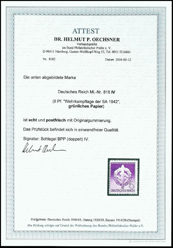 | Zusatzinformationen und Suchstichworte: | Dr. Reinhard Fischer 188. Auktion 1. - 3. September 2022 Los 2386 Deutsches Reich, 1933/45 Drittes Reich 6 Pfg Wehrkampftage der SA 1942 auf grünlichem Papier, tadellos postfrisch, gepr. Schlegel BPP und Fotoattest Dr. Oechsner BPP: " in einwandfreier Qualität.", Mi. 1.600.- Zuschlag 750,00 EUR |