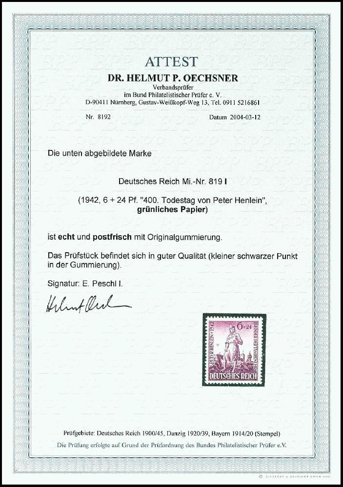 | Zusatzinformationen und Suchstichworte: | Dr. Reinhard Fischer 188. Auktion 1. - 3. September 2022 Los 2387 Deutsches Reich, 1933/45 Drittes Reich 6 Pfg 400. Todestag von Peter Henlein auf grünlichem Papier, postfrisch, gepr. Peschl BPP und Fotoattest Dr. Oechsner BPP: "in guter Qualität (kleiner schwarzer Punkt in der Gummierung).", Mi. 1.500.- Zuschlag 420,00 EUR |