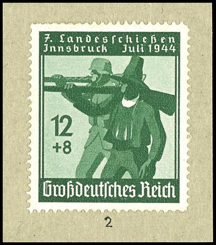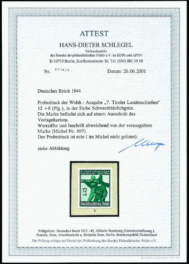 | Zusatzinformationen und Suchstichworte: | Dr. Reinhard Fischer 188. Auktion 1. - 3. September 2022 Los 2403 Deutsches Reich, 1933/45 Drittes Reich 12 Pfg + 8 Pfg "7.Tiroler Landesschießen", Probedruck in schwarzbläulichgrün, auf Ausschnitt eines Vorlagekartons, Wertziffer und Inschrift abweichend von der verausgabten Marke, nicht im Michel verzeichnet, sehr selten, Fotoattest H.-D. Schlegel BPP: "Der Probedruck ist echt.", ähnlich Jakubek - Bildtafel 212 Zuschlag 700,00 EUR |
