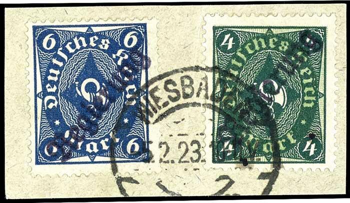 | Zusatzinformationen und Suchstichworte: | Dr. Reinhard Fischer 188. Auktion 1. - 3. September 2022 Los 2482 Deutsches Reich Dienst Regierung Wiesbaden 4 und 6 M. Posthorn, je Aufdrucktype II, zusammen auf Briefstück, gestempelt "WIESBADEN 5.2.23", tadellos, Fotobefund Weinbuch BPP (2018) "echt, einwandfrei"^, Mi. 200.-+ Ausruf 50,00 EUR |