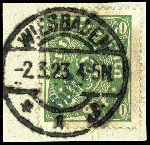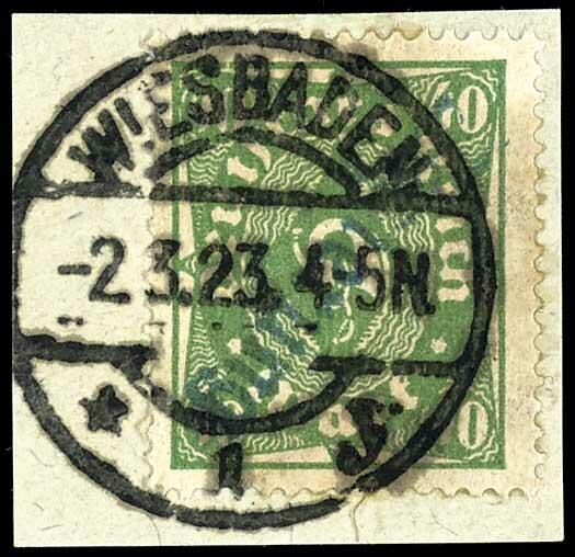 | Zusatzinformationen und Suchstichworte: | Dr. Reinhard Fischer 188. Auktion 1. - 3. September 2022 Los 2486 Deutsches Reich Dienst Regierung Wiesbaden 40 M. Posthorn mit kopfstehendem Aufdruck, Type IIa, auf Briefstück, tadellos gestempelt "WIESBADEN 2.3.23", gepr. und Fotobefund Weinbuch BPP "echt, einwandfrei", Mi. 140.- Ausruf 35,00 EUR |