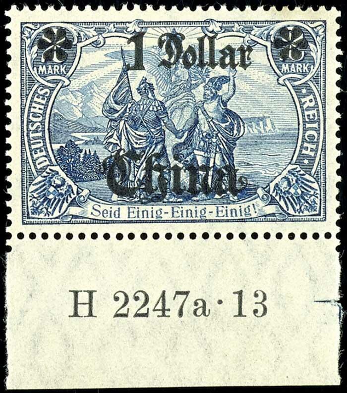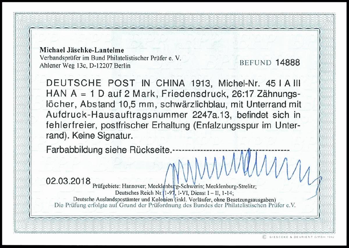 | Zusatzinformationen und Suchstichworte: | Dr. Reinhard Fischer 188. Auktion 1. - 3. September 2022 Los 2632 Deutsche Auslandspost China 1 Dollar auf 2 Mark vom Unterrand mit Aufdruck-Hausauftragsnummer 2247a.13, Marke tadellos postfrisch, Unterrand minimale Entfalzungsspur, Fotobefund Jäschke-Lantelme BPP: "fehlerfrei", Mi. 600.- für **, mit Falz im UR 70% = 420.- Ausruf 80,00 EUR |