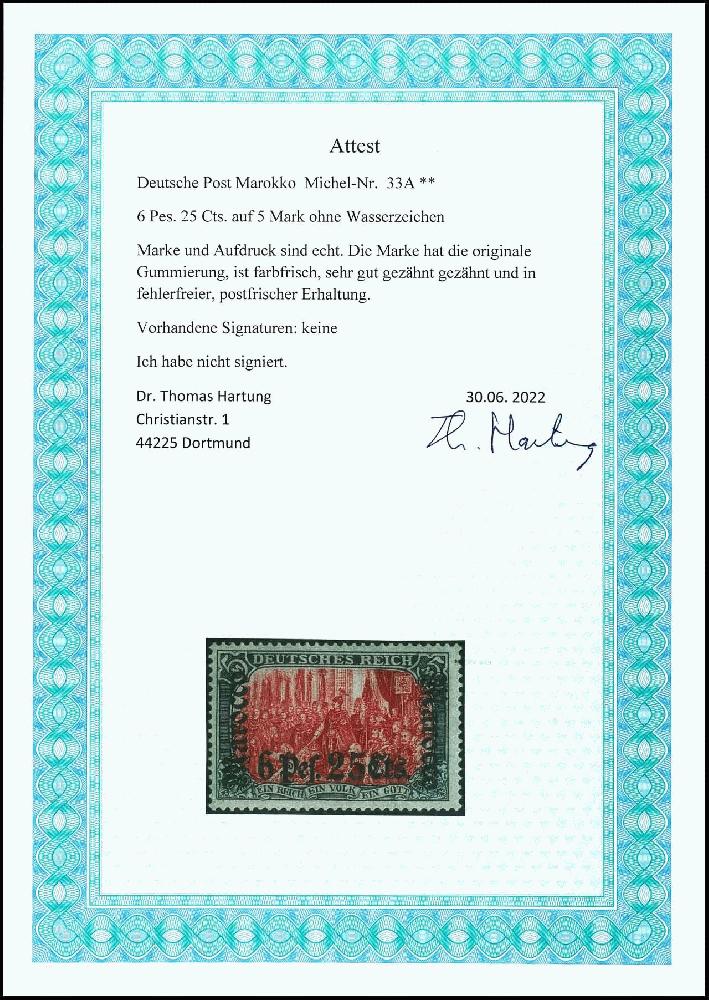 | Zusatzinformationen und Suchstichworte: | Dr. Reinhard Fischer 188. Auktion 1. - 3. September 2022 Los 2677 Deutsche Auslandspost Marokko 6 Pes. 25 Cts. auf 5 Mark ohne Wasserzeichen tadellos postfrisch und noch unsigniert, Fotoattest Dr. Hartung: "sehr gut gezähnt und in fehlerfreier, postfrischer Erhaltung." Mi. 420.- Zuschlag 160,00 EUR |