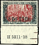 | Zusatzinformationen und Suchstichworte: | Dr. Reinhard Fischer 188. Auktion 1. - 3. September 2022 Los 2704 Deutsche Auslandspost Marokko 6 Pes. 25 Cts. auf 5 Mark Friedensdruck, Aufdruck rußig, vom Unterrand mit Aufdruck-Hausauftragsnummer 5311.18 und Plattennummer 4 tadellos postfrisch. Kleines violettes Zeichen auf dem Unterrand und Fotoattest Dr. Hartung: "sehr gut gezähnt und in fehlerfreier, postfrischer Erhaltung." Sehr selten! Mi. -,- Ausruf 600,00 EUR |