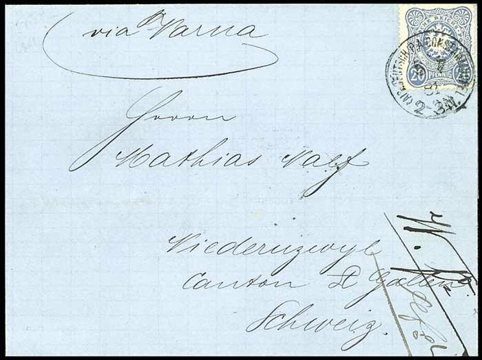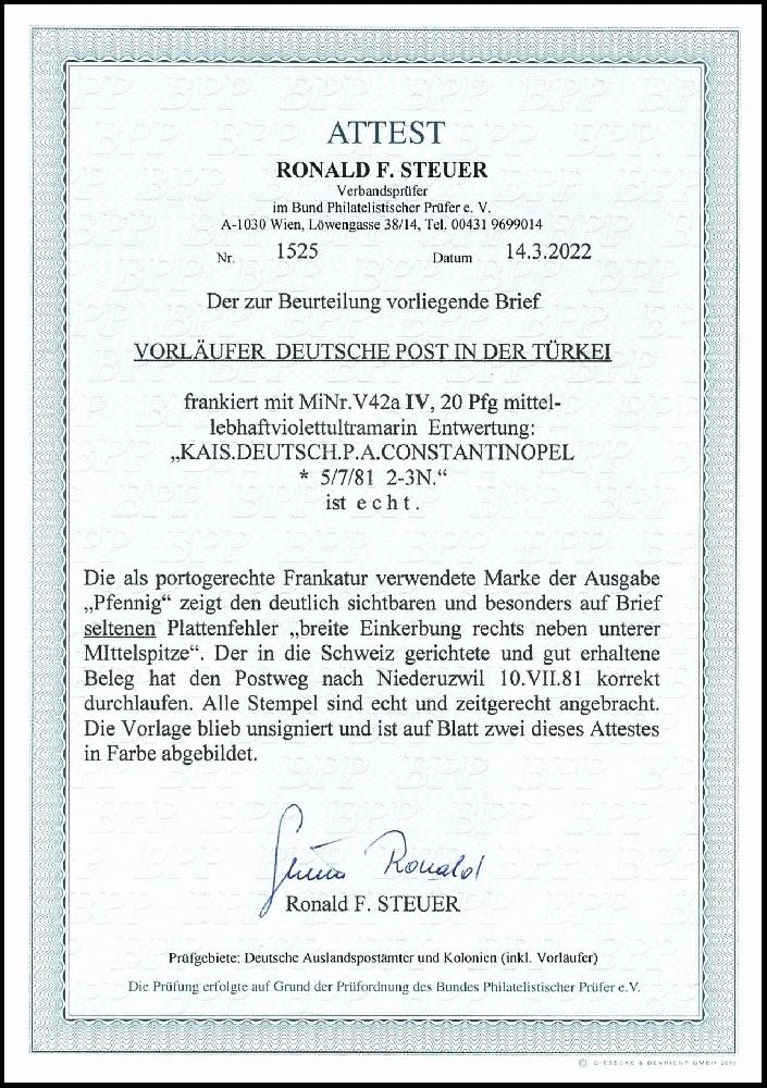 | Zusatzinformationen und Suchstichworte: | Dr. Reinhard Fischer 188. Auktion 1. - 3. September 2022 Los 2725 Deutsche Auslandspost Türkei, Vorläufer 20 Pfennig mittellebhaftviolettultramarin, Plattenfehler IV "breite Einkerbung rechts neben unterer Mittelspitze" als portogerechte Einzelfrankatur auf Brief von "KAIS. DEUTSCH. P.A. CONSTANTINOPEL * 5/7/81 2-3N." nach Niederuzwil in die Schweiz mit Ank.-Stempel vom 10.VII.81, tadellos, Fotoattest Steuer BPP (2022), Mi. für lose 800.-, auf Brief nicht einmal gelistet! Ausruf 800,00 EUR |