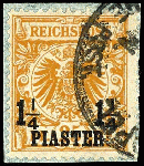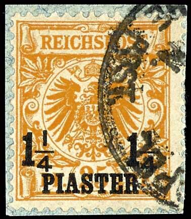 | Zusatzinformationen und Suchstichworte: | Dr. Reinhard Fischer 188. Auktion 1. - 3. September 2022 Los 2744 Deutsche Auslandspost Türkei 1 1/4 Pia auf 25 Pfg Krone/Adler gelborange mit Plattenfehler VI " 'I' in 'REICHSPOST' oben gespalten" auf kleinem Briefstück, tadellos gestempelt "CONSTANTINOPEL", Kabinett, gepr. Bothe BPP und Fotoattest Jäschke-Lantelme BPP "Die Marke auf Briefstück ist farbfrisch, gut gezähnt und befindet sich in fehlerfreier, gebrauchter Erhaltung, nicht repariert." Mi. 280,- Ausruf 70,00 EUR |