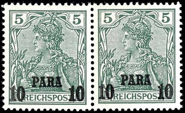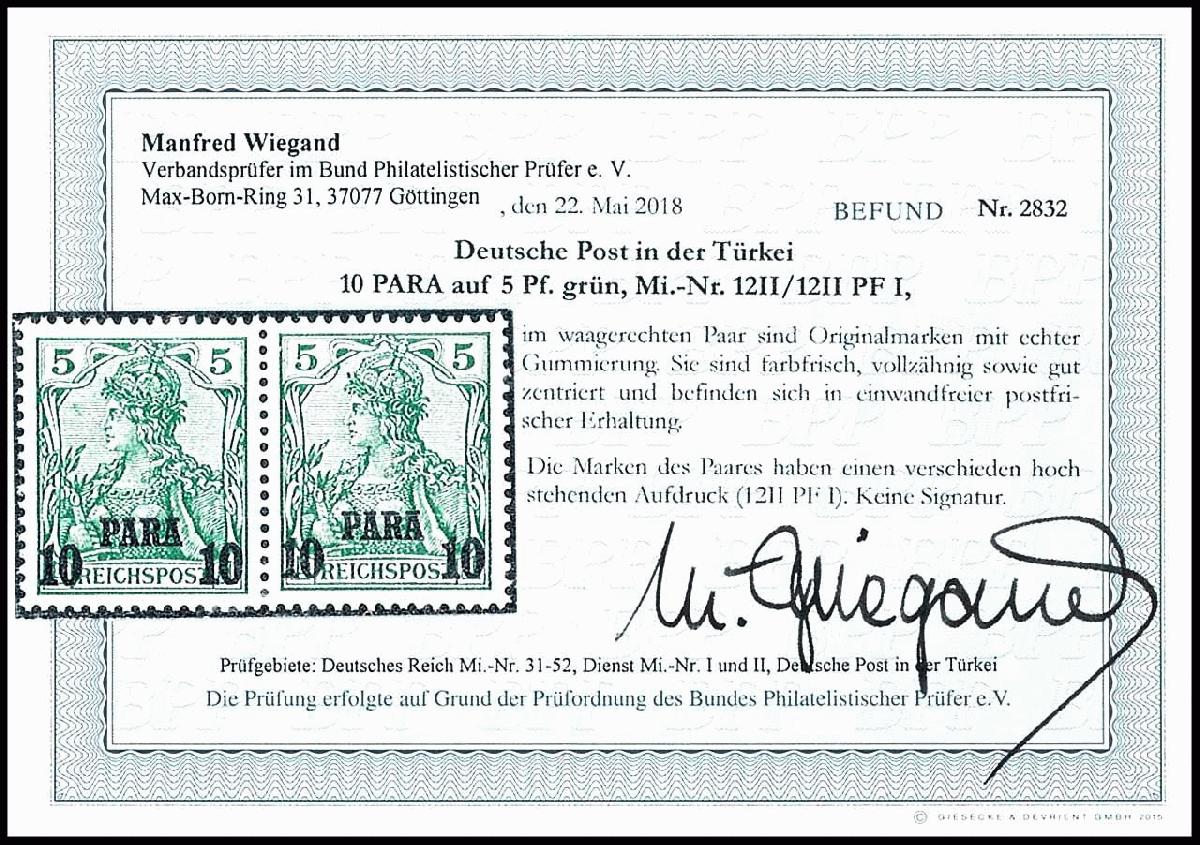 | Zusatzinformationen und Suchstichworte: | Dr. Reinhard Fischer 188. Auktion 1. - 3. September 2022 Los 2753 Deutsche Auslandspost Türkei 10 Pa auf 5 Pfg Germania, Aufdrucktype II, waagerechtes mit Aufdruckfehler I "verschieden hoch stehender Aufdruck", tadellos postfrisch, unsigniert, vorgefaltet, Kabinett, Fotobefund Wiegand BPP (2018) "...Originalmarken mit echter Gummierung. Sie sind farbfrisch, vollzähnig sowie gut zentriert und befinden sich in einwandfreier postfrischer Erhaltung.", Mi. 550.- Ausruf 100,00 EUR |