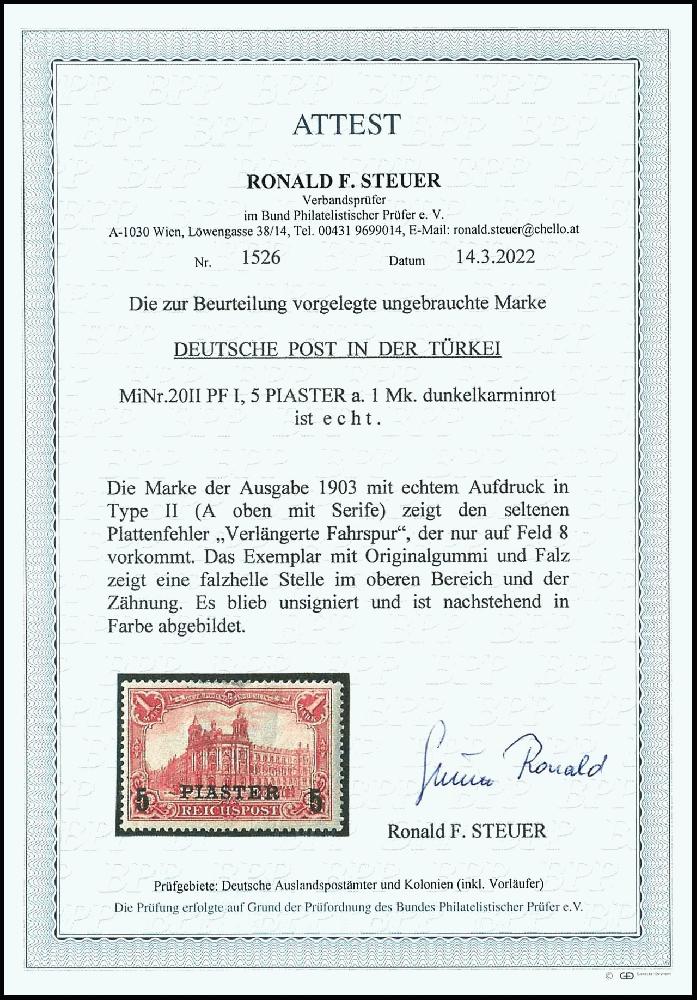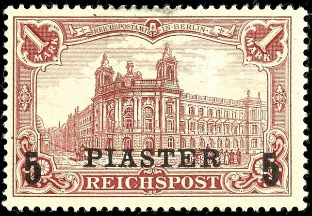 | Zusatzinformationen und Suchstichworte: | Dr. Reinhard Fischer 188. Auktion 1. - 3. September 2022 Los 2757 Deutsche Auslandspost Türkei 5 Piaster auf 1 Mark Reichspost, Aufdruck in Type II (A oben mit Serife), Plattenfehler II "verlängerte Fahrspur" (nur auf Feld 8 vorkommend!), ungebraucht mit Originalgummierung, falzhelle Stelle, Fotoattest Steuer BPP (2022), Mi. 600.- Ausruf 120,00 EUR |