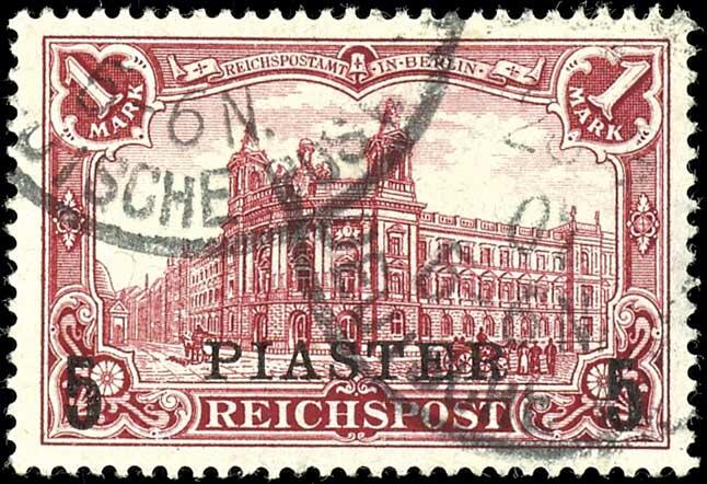 | Zusatzinformationen und Suchstichworte: | Dr. Reinhard Fischer 188. Auktion 1. - 3. September 2022 Los 2758 Deutsche Auslandspost Türkei 5 Piaster auf 1 Mark mit Plattenfehler "Blitz" (gebogene Linie) über Gebäudeteil ganz links, gestempelt "CONSTANTINOPEL 28.9.01", bis auf eine helle Stelle rückseitig tadellos, Fotoattest Jäschke-Lantelme BPP, Mi. 3.000,- Ausruf 300,00 EUR |