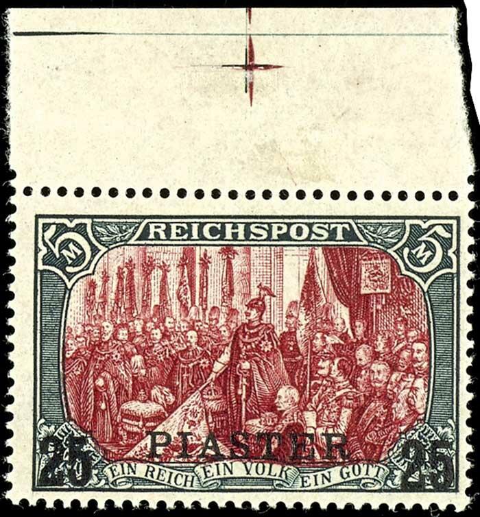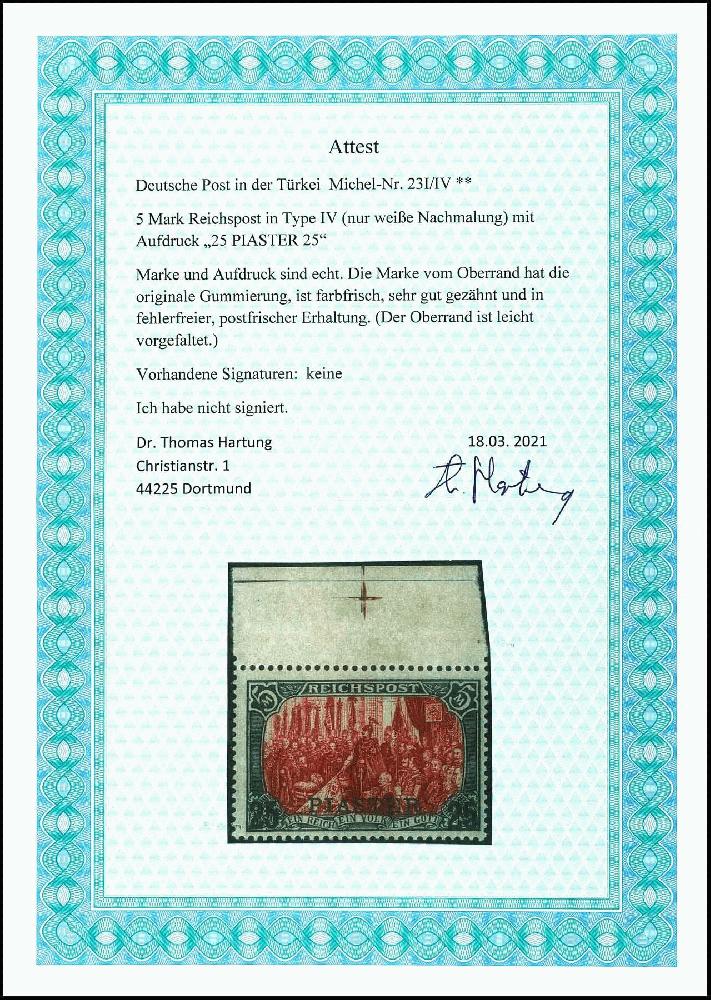 | Zusatzinformationen und Suchstichworte: | Dr. Reinhard Fischer 188. Auktion 1. - 3. September 2022 Los 2765 Deutsche Auslandspost Türkei 25 Piaster auf 5 Mark Reichspost in Type I/IV (nur weiße Nachmalung) tadellos postfrisch vom Oberrand, noch unsigniert, Fotoattest Dr. Hartung: "sehr gut gezähnt und in fehlerfreier, postfrischer Erhaltung." Mi. 950.- Zuschlag 650,00 EUR |