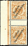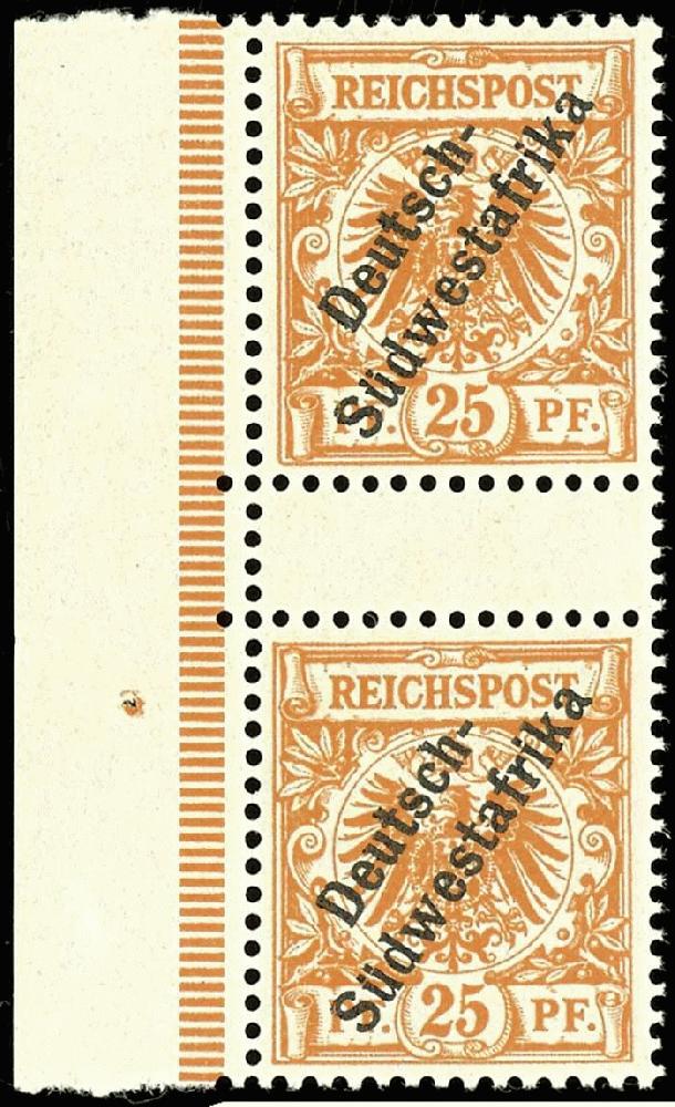 | Zusatzinformationen und Suchstichworte: | Dr. Reinhard Fischer 188. Auktion 1. - 3. September 2022 Los 2890 Deutsche Kolonien Südwestafrika 25 Pfennig Krone/Adler mit schwarzem Bdr.-Aufdruck Deutsch-Südwestafrika", dunkelorange, senkrechtes Zwischenstegpaar vom linken Bogenrand, bis auf eine zarte Haftspur bei der oberen Marke in tadelloser postfrischer Erhaltung, sehr selten, Fotoattest Steuer BPP: "sehr seltene Vorlage.", Mi. ** 4.300 / * 1.700.- - wenn man die Marken einzeln wertet ergibt sich ein Katalogwert von 2.240.- - postfrische Einzelstücke der 9b erzielten bei unseren Auktionen zwischen 900 - 1.300.- Euro Zuschlag zzgl. Aufgeld!Günstige Gelegenheit diese Kolonial-Seltenheit zu kaufen Ausruf 800,00 EUR |