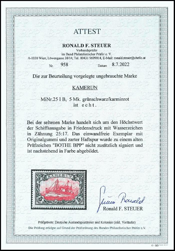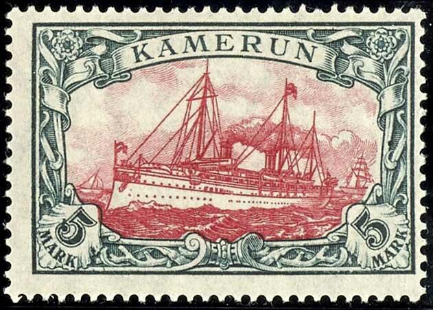 | Zusatzinformationen und Suchstichworte: | Dr. Reinhard Fischer 188. Auktion 1. - 3. September 2022 Los 2933 Deutsche Kolonien Kamerun 5 Mark "Kaiseryacht" mit Wasserzeichen, Friedensdruck in Zähnung 25:17, tadellos, ungebraucht, kaum sichtbare Falzspur, sehr selten und völlig unterbewertet, Fotoattest Steuer BPP, Mi. 1000,- +++ Zuschlag 350,00 EUR |