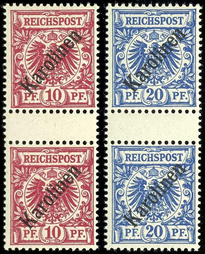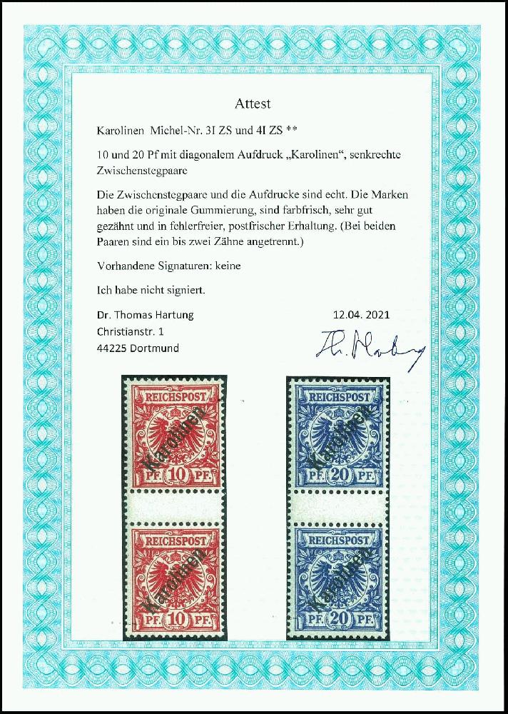 | Zusatzinformationen und Suchstichworte: | Dr. Reinhard Fischer 188. Auktion 1. - 3. September 2022 Los 2957 Deutsche Kolonien Karolinen 10 und 20 Pf Diagonalaufdruck je als senkrechtes Zwischenstegpaar postfrisch und noch unsigniert, Fotoattest Dr. Hartung: "sehr gut gezähnt und in fehlerfreier, postfrischer Erhaltung. (Bei beiden Paaren sind ein bis zwei Zähne angetrennt.)" Mi. 1.400.- Ausruf 350,00 EUR |