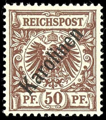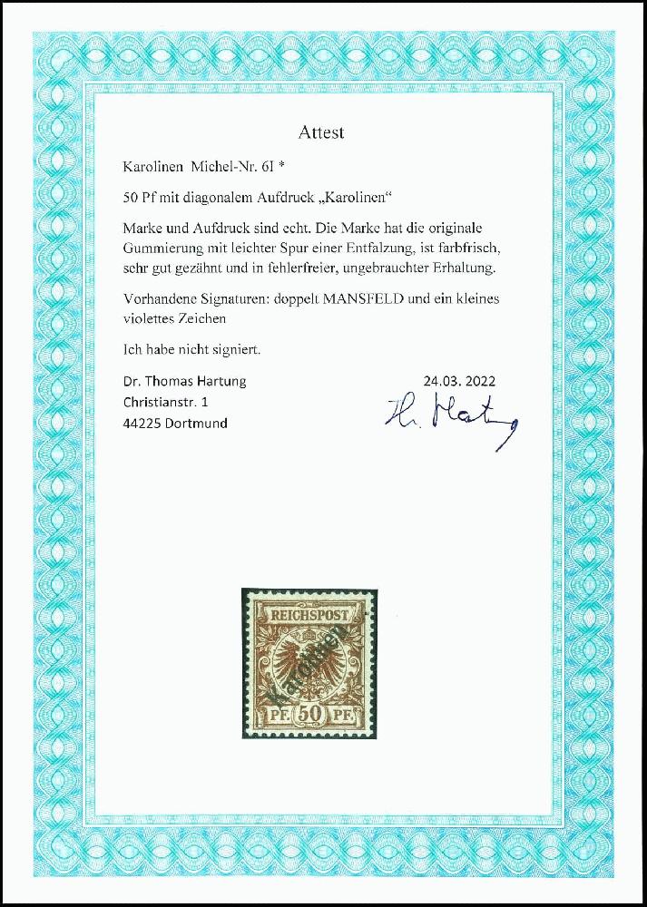 | Zusatzinformationen und Suchstichworte: | Dr. Reinhard Fischer 188. Auktion 1. - 3. September 2022 Los 2961 Deutsche Kolonien Karolinen 50 Pf mit diagonalem Aufdruck tadellos ungebraucht mit leichter Spur einer Entfalzung, doppelt gepr. Mansfeld und Fotoattest Dr. Hartung: "sehr gut gezähnt und in fehlerfreier, ungebrauchter Erhaltung." Mi. 800.- Ausruf 200,00 EUR |