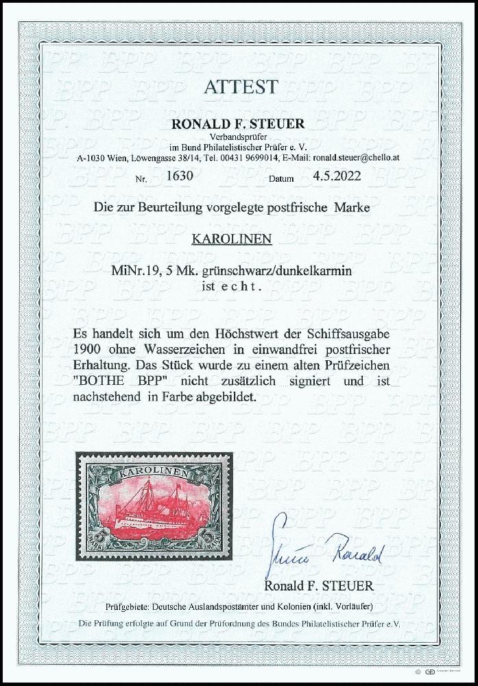 | Zusatzinformationen und Suchstichworte: | Dr. Reinhard Fischer 188. Auktion 1. - 3. September 2022 Los 2976 Deutsche Kolonien Karolinen 5 Mark Kaiseryacht, tadellos postfrisch, gepr. Bothe BPP und Fotoattest Steuer BPP (2022): "in einwandfrei postfrischer Erhaltung.", Mi. 700.- Ausruf 250,00 EUR |