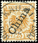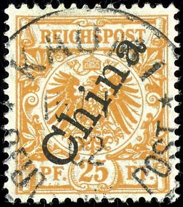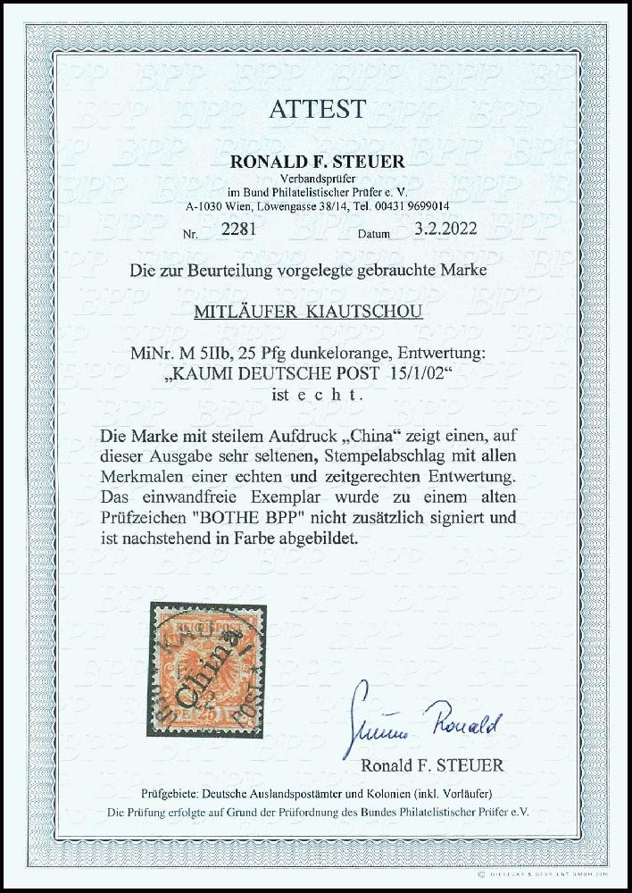 | Zusatzinformationen und Suchstichworte: | Dr. Reinhard Fischer 188. Auktion 1. - 3. September 2022 Los 2996 Deutsche Kolonien Kiautschou, Vorläufer Mitläufer 25 Pfennig "Krone/Adler" in b-Farbe mit steilem Aufdruck China, entwertet "KAUMI DEUTSCHE POST 15/1/02", tadellos, sehr selten, neues Fotoattest Steuer BPP, Mi./Steuer 900,- Ausruf 300,00 EUR |