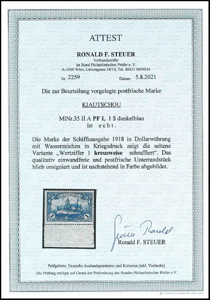 | Zusatzinformationen und Suchstichworte: | Dr. Reinhard Fischer 188. Auktion 1. - 3. September 2022 Los 3008 Deutsche Kolonien Kiautschou 1 Dollar Kaiseryacht, Kriegsdruck, A-Zähnung mit Plattenfehler I "Wertziffer 1 kreuzweise schraffiert", Unterrandstück, tadellos postfrisch, unsigniert, Fotoattest Steuer BPP (2021): "qualitativ einwandfrei", Mi. unsinnige Bewertung, die Type IIA steht ohne Plattenfehler schon 7 x mehr als die IIB! Zuschlag 500,00 EUR |