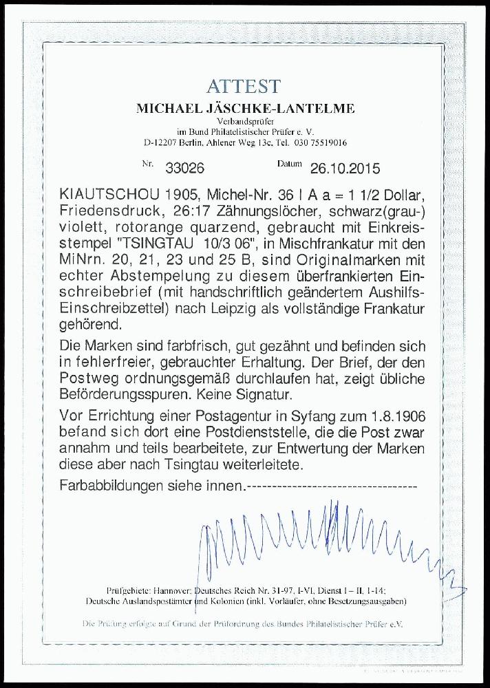 | Zusatzinformationen und Suchstichworte: | Dr. Reinhard Fischer 188. Auktion 1. - 3. September 2022 Los 3009 Deutsche Kolonien Kiautschou 1 1/2 Dollar Kaiseryacht, Friedensdruck, 26 : 17 Zähnungslöcher zusammen mit 4 Cent, 10 Cent, 40 Cent und 1 Dollar Kaiseryacht ohne Wasserzeichen auf überfrankiertem R-Brief (handschriftlich geänderter Aushilfs-Einschreibezettel) von Syfang mit Entwertung "TSINGTAU 10/3 06" nach Leipzig, rückseitig Ausgabestempel "L15 19.4", Marken in tadelloser Erhaltung, Umschlag übliche Beförderungsspuren, Fotoattest Jäschke-Lantelme BPP (2015): " Vor Errichtung einer Postagentur in Syfang zum 1.8.1906 befand sich dort eine Postdienststelle, die die Post zwar annahm und teils bearbeitete, zur Entwertung der Marken diese aber nach Tsingtau weiterleitete." Ausruf 500,00 EUR |