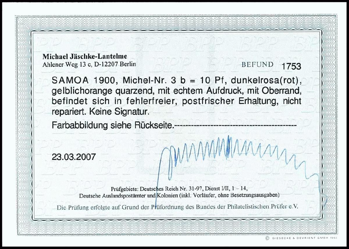 | Prüfer: | Jäschke-Lantelme, Michael (BPP (Bund Philatelistischer Prüfer)) |