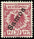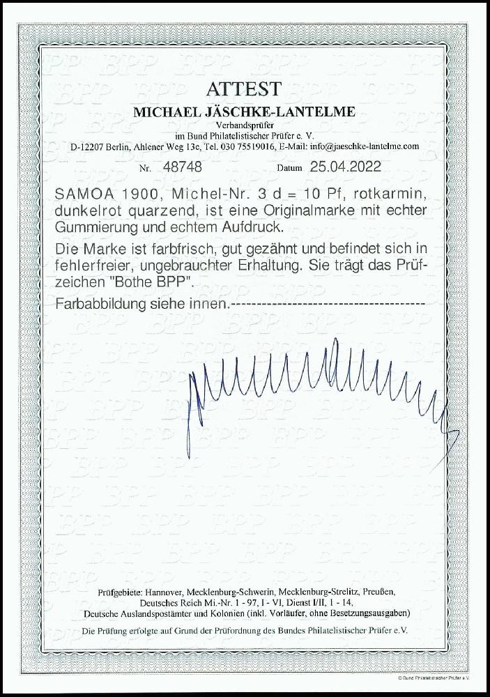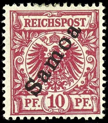 | Zusatzinformationen und Suchstichworte: | Dr. Reinhard Fischer 188. Auktion 1. - 3. September 2022 Los 3047 Deutsche Kolonien Samoa 10 Pfg Krone/Adler mit Bdr.-Aufdruck "Samoa", rotkarmin, tadellos ungebraucht, Fotoattest Jäschke-Lantelme BPP "in fehlerfreier Erhaltung", Mi. 750.- Zuschlag 460,00 EUR |