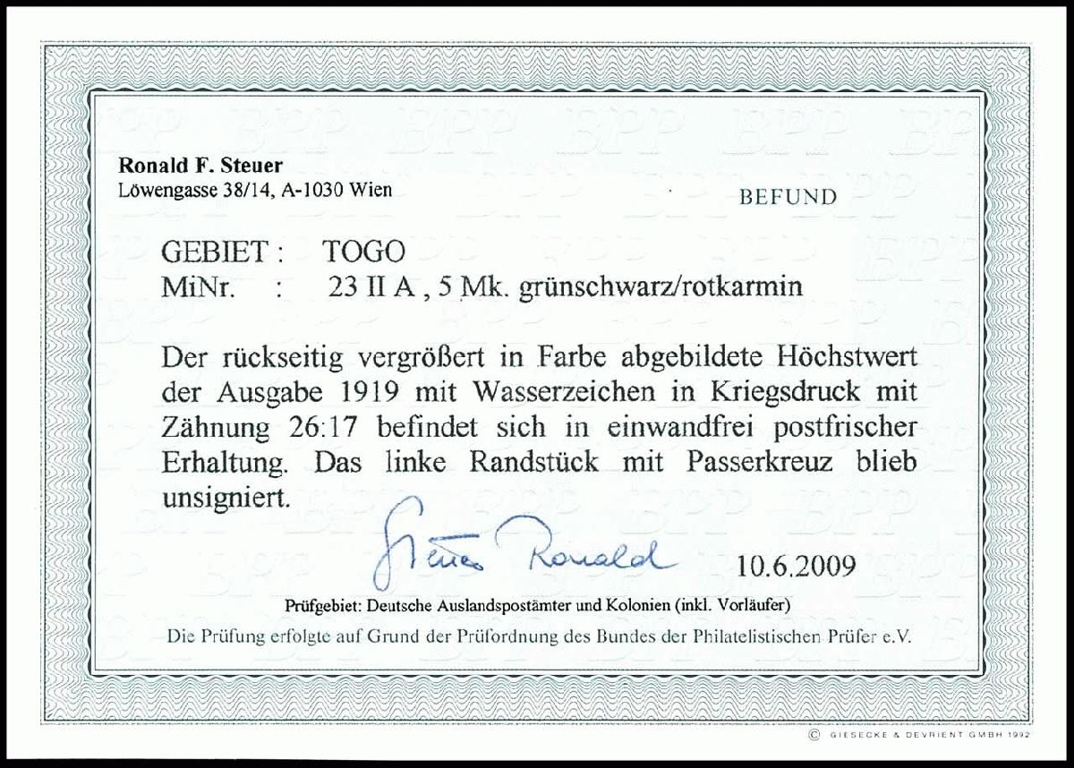 | Zusatzinformationen und Suchstichworte: | Dr. Reinhard Fischer 188. Auktion 1. - 3. September 2022 Los 3083 Deutsche Kolonien Togo 5 Mark Kaiseryacht, gezähnt 26:17, Kriegsdruck, tadellos postfrisch, vom linken Bogenrand, unsigniert, Fotobefund Steuer BPP: "echt und einwandfrei", Mi. 380.- (unterbewertet) Zuschlag 180,00 EUR |