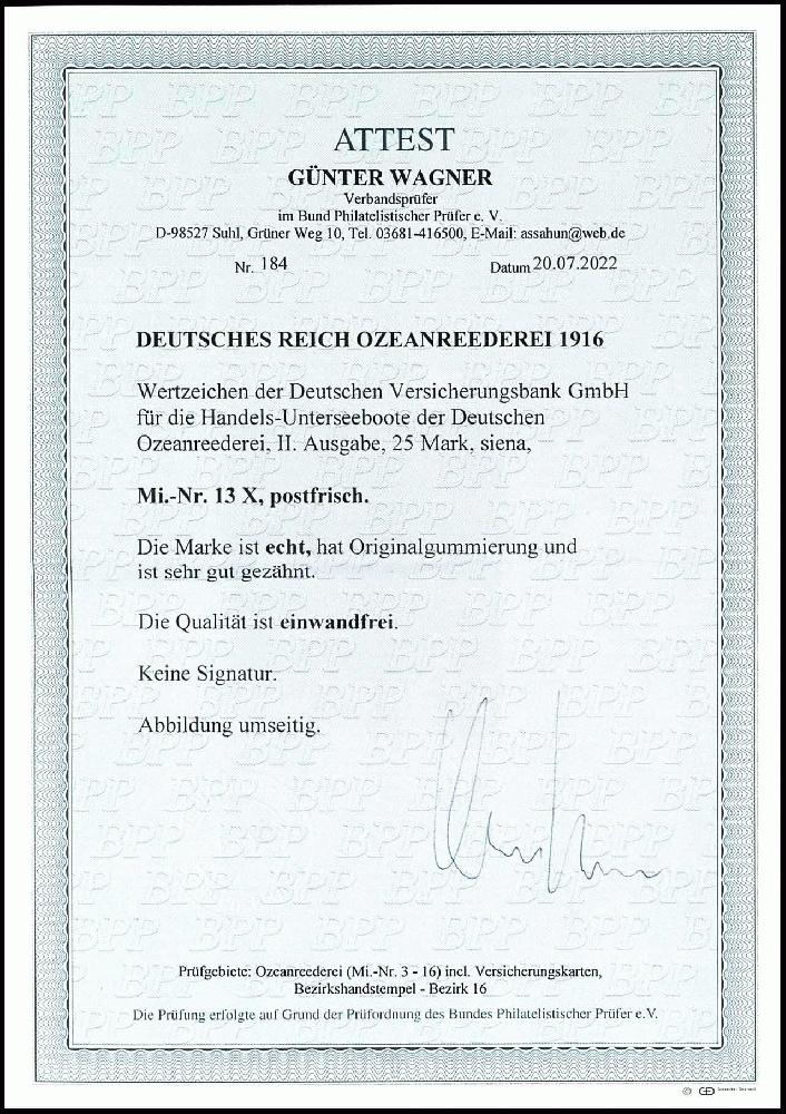 | Prüfgebiet: | Deutsches Reich Schiffspost im Ausland Ozeanreederei 1916/17 |