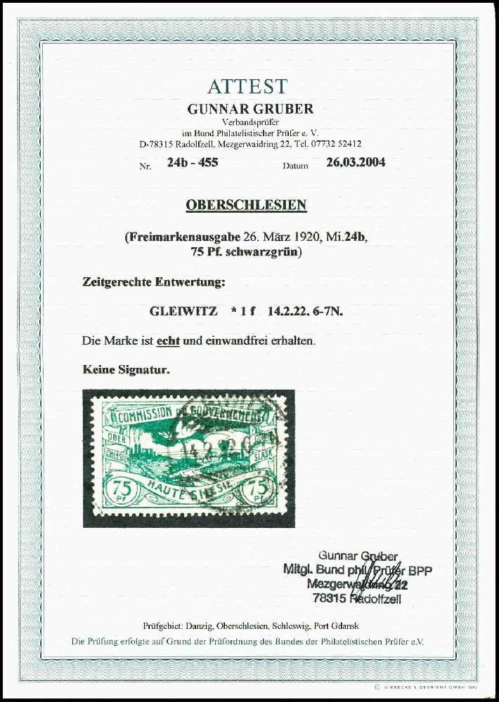| Zusatzinformationen und Suchstichworte: | Dr. Reinhard Fischer 188. Auktion 1. - 3. September 2022 Los 5375 Oberschlesien 75 Pfg. schwarzgrün, gestempelt "GLEIWITZ 14.2.22", tadellos, Fotoattest Gruber BPP, Mi. 1300, Zuschlag 240,00 EUR |