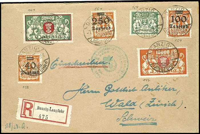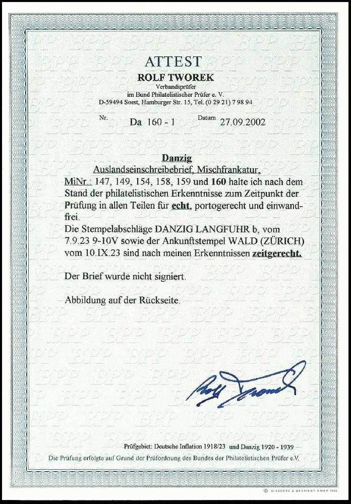 | Zusatzinformationen und Suchstichworte: | Dr. Reinhard Fischer 188. Auktion 1. - 3. September 2022 Los 3248 Danzig 250 Tausend auf 200 Mark in Mischfrankatur mit Mi.-Nr. 147, 149, 154, 158 und 159 als portogerechte Frankatur auf R-Brief in die Schweiz, entwertet "Danzig Langfuhr b 7.9.23", rückseitig Ank.-Stempel "Wald (Zürich) 10.IX.23", Fotoattest Tworek BPP: "echt, portogerecht und einwandfrei" Mi. ca. 850.- Zuschlag 310,00 EUR |