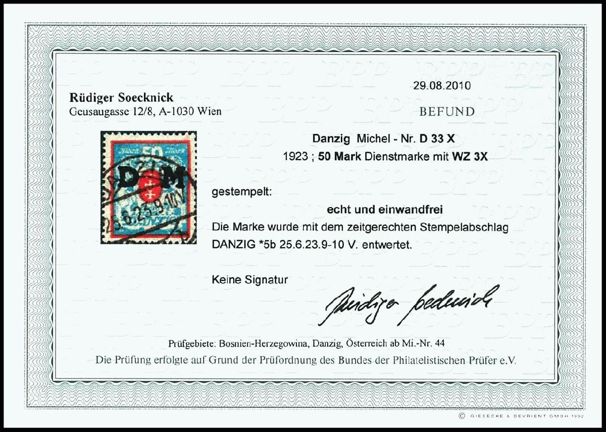 | Zusatzinformationen und Suchstichworte: | Dr. Reinhard Fischer 188. Auktion 1. - 3. September 2022 Los 3281 Danzig 50 Mark großes Staatswappen mit schwarzem Bdr.-Aufdruck "D M", stehendes Wasserzeichen, zeitgerecht gestempelt "Danzig * 5b 26.6.23 9-10V", Fotobefund Soecknick BPP "echt und einwandfrei", Mi. 800.- Ausruf 200,00 EUR |