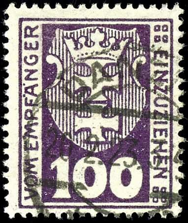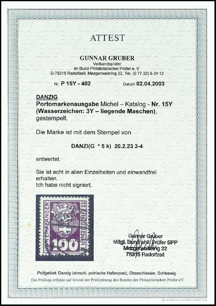 | Zusatzinformationen und Suchstichworte: | Dr. Reinhard Fischer 188. Auktion 1. - 3. September 2022 Los 3289 Danzig 100 Pfennig Portomarke, Wz. 3Y (liegende Maschen), zeitgerecht entwertet "Danzig * 5k 20.2.23, tadellos erhalten, echt gestempelt sehr seltene Marke, Fotoattest Gruber BPP: "echt und einwandfrei", Mi. 900.- Ausruf 300,00 EUR |