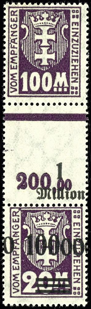 | Zusatzinformationen und Suchstichworte: | Dr. Reinhard Fischer 188. Auktion 1. - 3. September 2022 Los 3295 Danzig 100 M. Unterrand und 100000 auf 20 M. Oberrand in senkrechtem Zusammendruck aus unzerteilt gebliebenem Druckbogen, postfrisch, selten, Fotoattest Dr. Oechsner BPP (für 4er-Block), Mi. 750,- Zuschlag 540,00 EUR |