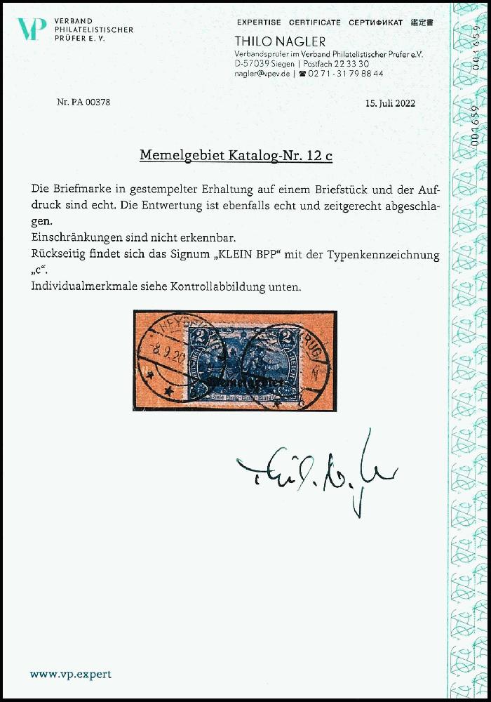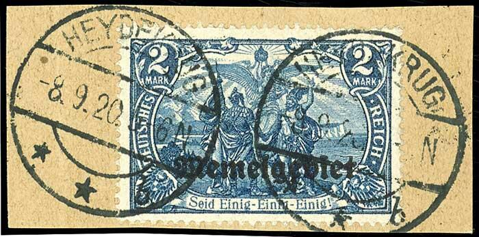 | Zusatzinformationen und Suchstichworte: | Dr. Reinhard Fischer 188. Auktion 1. - 3. September 2022 Los 3307 Memel 2 Mark Deutsches Reich mit Aufdruck "Memelgebiet", schwärzlichblau, gestempelt "Heydekrug 8.9.20" auf Briefstück, tadellose Erhaltung, Expertise Nagler VP (2022), Mi. 700.- - eine seltene Marke! Ausruf 250,00 EUR |