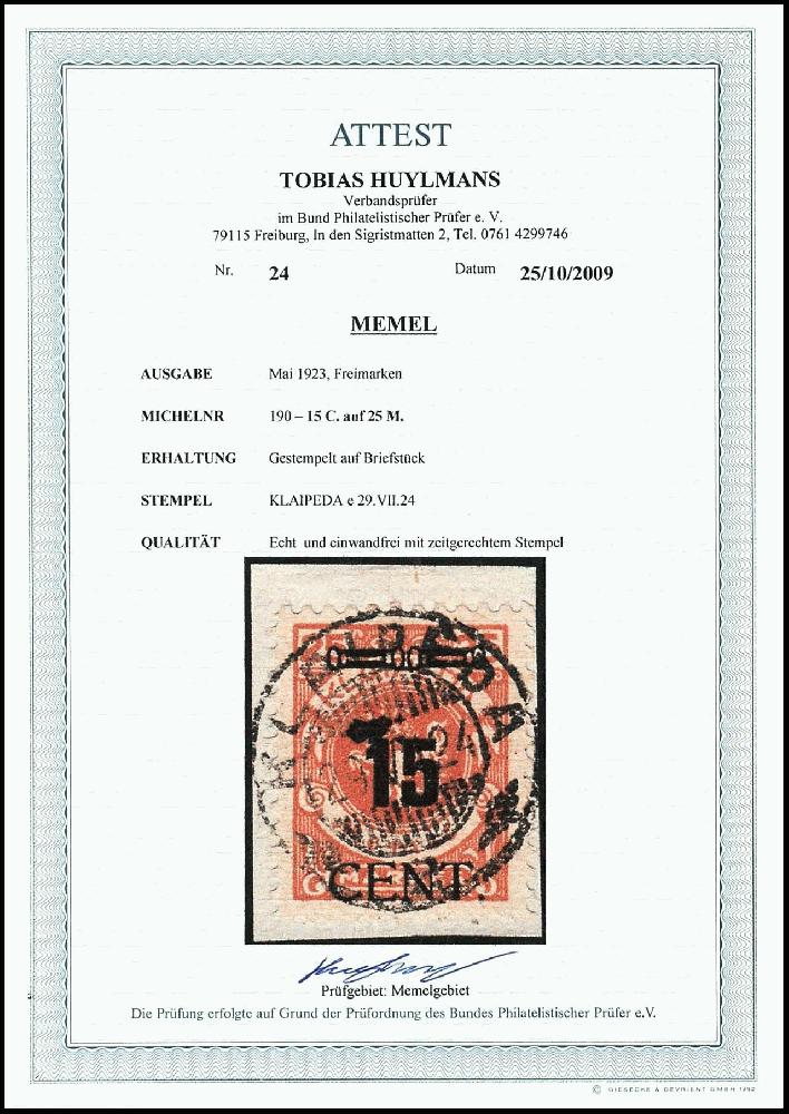 | Zusatzinformationen und Suchstichworte: | Dr. Reinhard Fischer 188. Auktion 1. - 3. September 2022 Los 3321 Memel 15 c. auf 25 M. gestempelt "KLAIPEDA 29.VII.24" auf Briefstück, Fotoattest Huylmans BPP, Mi. 850,-, Zuschlag 250,00 EUR |