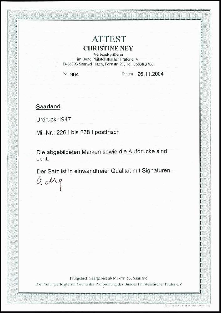 | Zusatzinformationen und Suchstichworte: | Dr. Reinhard Fischer 188. Auktion 1. - 3. September 2022 Los 3370 Saar 10 c. auf 2 Pfg. - 50 Fr. auf 1 M. sogenannter Urdruck, postfrisch kpl., sign Arge Saar bzw. Dr. Dub, Fotoattest Ney BPP, Mi. 3500,-, Ausruf 1.000,00 EUR |
