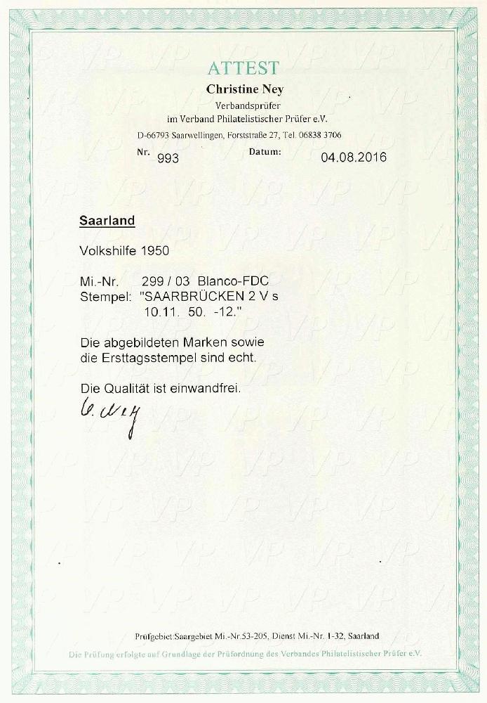 | Zusatzinformationen und Suchstichworte: | Dr. Reinhard Fischer 188. Auktion 1. - 3. September 2022 Los 3402 Saar Volkshilfe 1950 "SAARBRÜCKEN 2 V s 10.11.50 -12" auf Blanko-FDC, Fotoattest Ney VP (2016) "Die abgebildeten Marken sowie die Ersttagsstempel sind echt. Die Qualität ist einwandfrei." Mi. 750.- Ausruf 170,00 EUR |