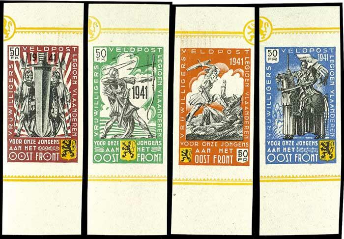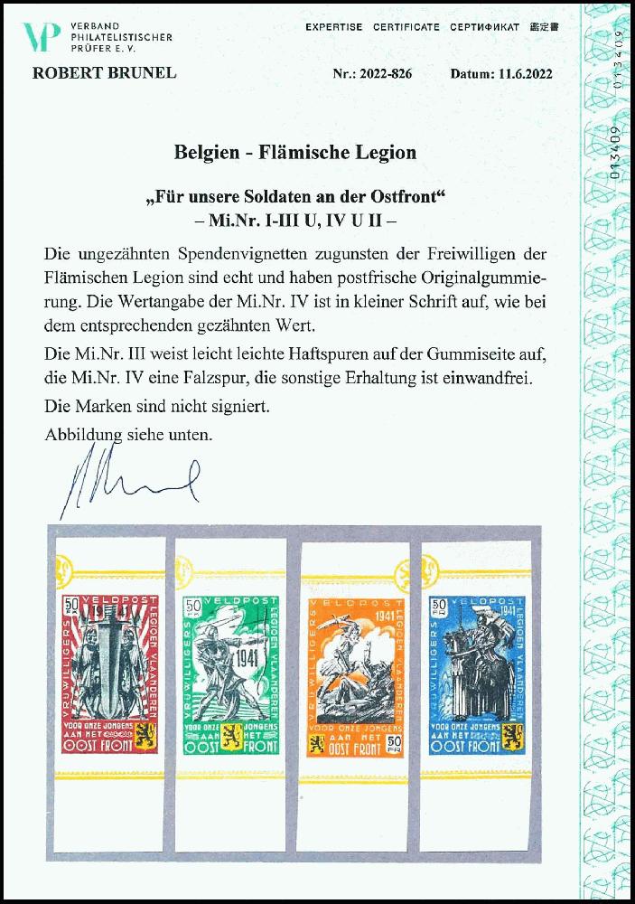 | Zusatzinformationen und Suchstichworte: | Dr. Reinhard Fischer 188. Auktion 1. - 3. September 2022 Los 3456 Deutsche Besetzung II. WK Belgien Flämische Legion + 50 Fr ."Für unser Soldaten an der Ostfront", alle vier Farben, Abart "ungezähnt", 50 C. blau in seltener Type II (kleine Schrift der Wertangabe), postfrisch/ungebraucht, Expertise Brunel VP (2022): "Die Mi.Nr. III weist leichte Haftspuren auf der Gummiseite auf, die Mi.Nr. IV eine Falzspur, die sonstige Erhaltung ist einwandfrei.", Mi. 1.420.- für * und **, seltene Ausgabe, zumal die 50 C. blau in Type II! Ausruf 450,00 EUR |
