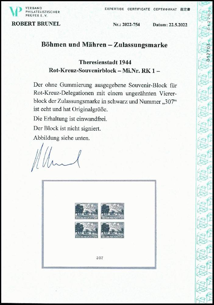 | Zusatzinformationen und Suchstichworte: | Dr. Reinhard Fischer 188. Auktion 1. - 3. September 2022 Los 3450 Böhmen und Mähren Theresienstadt Souvenir-Blockausgabe "Rotes Kreuz" anlässlich ausländischer Rotkreuz-Delegationen im Ghetto Theresienstadt, Nummer 307, schwarz, tadellos postfrisch, Expertise Robert Brunel VP (2022): "Die Erhaltung ist einwandfrei.", Mi. 700.- eher Unfug, in unserer 176. Auktion erzielten wir für ein qualitativ gleichwertiges Exemplar bereits 850.- Euro! Zuschlag 950,00 EUR |