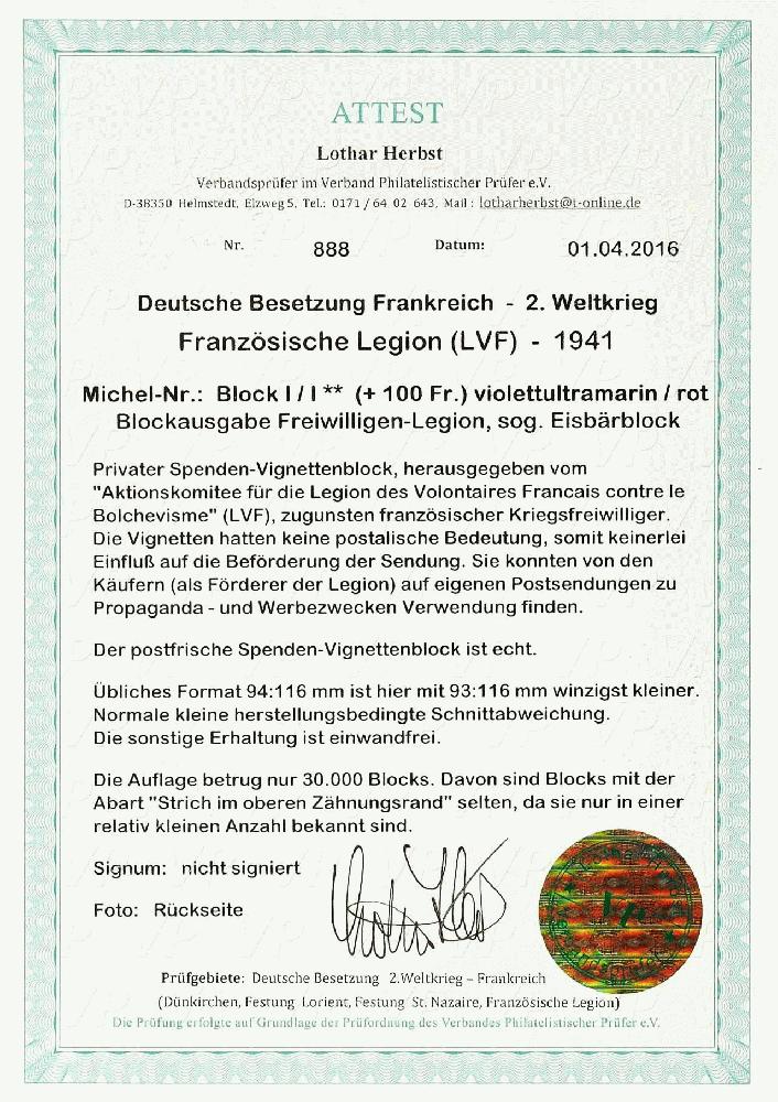 | Zusatzinformationen und Suchstichworte: | Dr. Reinhard Fischer 188. Auktion 1. - 3. September 2022 Los 3481 Deutsche Besetzung II. WK Französische Legion Blockausgabe "Freiwilligen-Legion" - sog. Eisbär-Block, Plattenfehler I, postfrisch, Format durch herstellungsbedingte Schnittabweichung 93 : 116 anstatt 94 : 116, Fotoattest Lothar Herbst VP (2016): ".... Die sonstige Erhaltung ist einwandfrei. Die Auflage betrug nur 30.000 Blocks. Davon sind Blocks mit der Abart "Strich im oberen Zähnungsrand" selten, da sie nur in einer relativ kleinen Anzahl bekannt sind.", Mi. 1.200.- Ausruf 250,00 EUR |