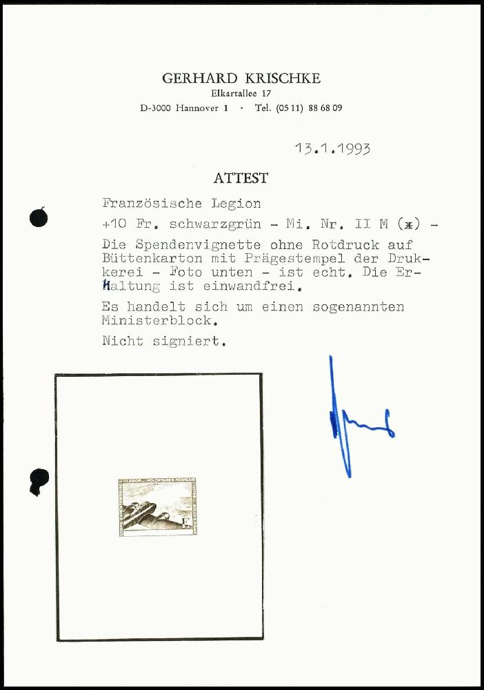 | Zusatzinformationen und Suchstichworte: | Dr. Reinhard Fischer 188. Auktion 1. - 3. September 2022 Los 3484 Deutsche Besetzung II. WK Französische Legion Ministerblock in schwarzopalgrün auf Büttenkarton, tadellose Erhaltung, Auflage nur ca. 200 Exemplare, unsigniert, Fotoattest Krischke: "Die Erhaltung ist einwandfrei.", Mi. 900.- Ausruf 400,00 EUR |