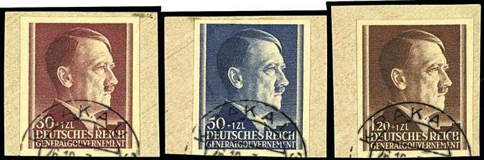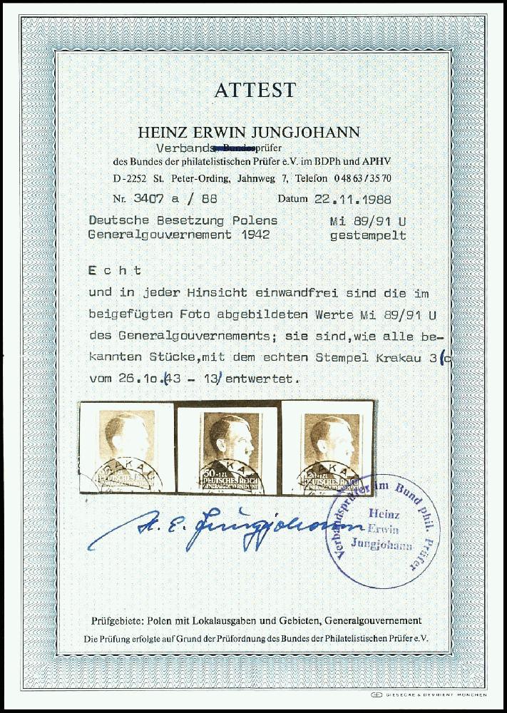 | Zusatzinformationen und Suchstichworte: | Dr. Reinhard Fischer 188. Auktion 1. - 3. September 2022 Los 3505 Generalgouvernement 30 Gr. bis 1,20 Zl. "Hitler", Abart "ungezähnt", kompletter Satz mit drei Werten, gestempelt "Krakau 3 c 26.10.43" auf drei Briefstücken, tadellose Erhaltung, sehr selten und nur wenige gestempelte Sätze bekannt, Fotoattest Jungjohann BPP: "echt und einwandfrei.", Mi. 6.000.- - kaum angebotene Rarität! Ausruf 1.800,00 EUR |