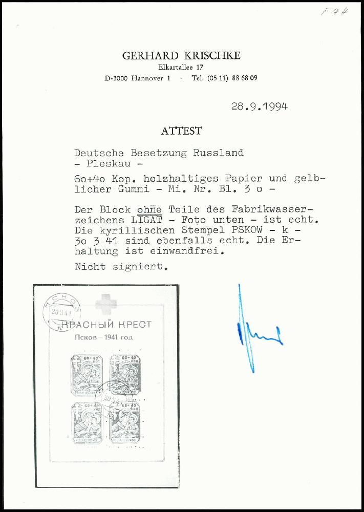 | Zusatzinformationen und Suchstichworte: | Dr. Reinhard Fischer 188. Auktion 1. - 3. September 2022 Los 3532 Deutsche Besetzung II. WK Russland - Pleskau Blockausgabe "Deutsches Rotes Kreuz" auf holzhaltigem Papier mit gelblicher Gummierung, ohne Fabrik-Wasserzeichen, gestempelt "PSKOW -k- 30 3 41", tadellose Erhaltung, unsigniert, Fotoattest Krischke: "Die Erhaltung ist einwandfrei.", Mi. 1.600.- - in dieser Qualität selten! Zuschlag 800,00 EUR |