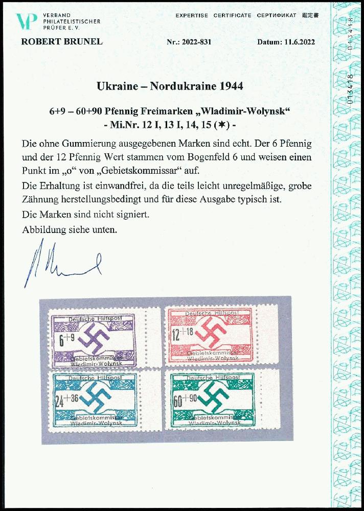 | Zusatzinformationen und Suchstichworte: | Dr. Reinhard Fischer 188. Auktion 1. - 3. September 2022 Los 3545 Deutsche Besetzung II. WK Ukraine Nordukraine 6 Pfg bis 60 Pfg "Wladimir-Wolynsk", kompletter Satz mit vier Werten, tadellos ungebraucht ohne Gummierung - wie verausgabt, Mi.-Nr. 12 und 13 je Plattenfehler I, unsigniert, Expertise Robert Brunel VP (2022): "Die Erhaltung ist einwandfrei, da die teils unregelmäßige Zähnung herstellungsbedingt und für diese Ausgabe typisch ist.", Mi. 1.400.- - vollständige Sätze in einwandfreier Erhaltung erzielten auf unseren Auktionen schon 820.- Euro zzgl. Aufgeld! Weitaus seltener, als die Katalogbewertung es vermuten lässt Zuschlag 700,00 EUR |