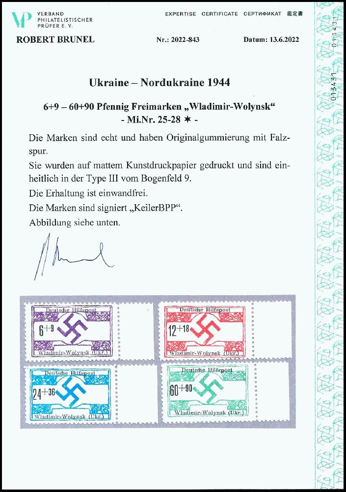 | Zusatzinformationen und Suchstichworte: | Dr. Reinhard Fischer 188. Auktion 1. - 3. September 2022 Los 3556 Deutsche Besetzung II. WK Ukraine Nordukraine 6 Pfg bis 60 Pfg Hilfspost Wladimir-Wolynsk, einheitlich Feld 9 - Type III, vier Werte - kompletter Satz, ungebraucht mit Originalgummierung, Expertise Brunel VP (2022): "Die Erhaltung ist einwandfrei.", Mi. 420.- Zuschlag 220,00 EUR |
