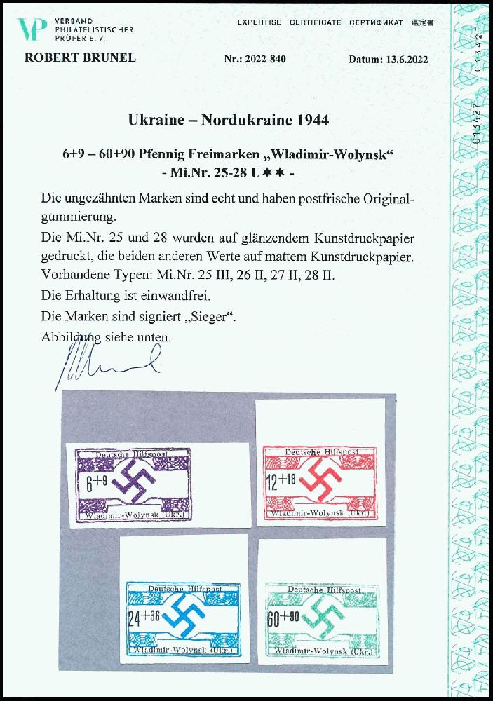 | Zusatzinformationen und Suchstichworte: | Dr. Reinhard Fischer 188. Auktion 1. - 3. September 2022 Los 3557 Deutsche Besetzung II. WK Ukraine Nordukraine 6 Pfg bis 60 Pfg Hilfspost Wladimir-Wolynsk, ungezähnt, vier Werte - kompletter Satz, je vom Bogenrand, tadellos postfrisch, Auflage nur 150 Sätze, gepr. Sieger und Expertise Brunel VP (2022): "Die Erhaltung ist einwandfrei.", Mi. 2.500.- (unterbewertet) Zuschlag 1.400,00 EUR |